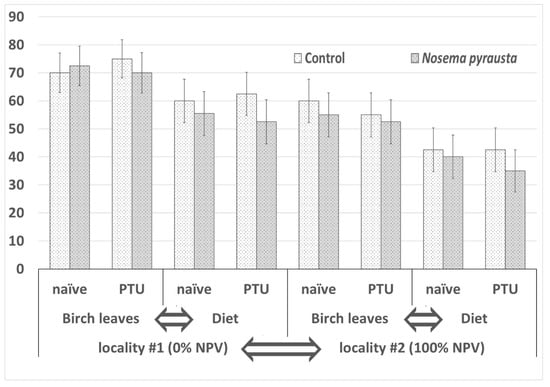 The second instar gypsy moth larvae from locality #1 fed with Nosema pyrausta spores and maintained on birch leaves successfully completed larval development and proceeded to pupation at the level of 72.5 ± 7.06% (mean ± SE, number of assayed insects n = 40) when not pretreated with PTU (naïve). Similarly, 70 ± 7.26% (n = 40) of PTU-pretreated insects pupated. When an artificial diet was used instead of fresh birch leaves, the pupation level estimates reached only 55.5 ± 7.86% (n = 40) and 52.5 ± 7.90% (n = 40), respectively. Survival levels in N. pyrausta-treated groups were about the same as in the respective control groups (Figure 3).