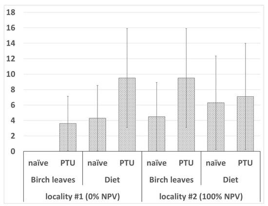 N. pyrausta infection was revealed in several pupae and prepupae across the experimental groups treated with parasite spores. The parasite spore masses were located in salivary gland and/or adipose tissue cells (Figure 2C,D). In the sample from locality #1, 0% (number of examined insects n = 29) and 3.6 ± 3.52% (n = 28) of the insects fed on birch leaves were infected in the naïve and PTU-pretreated groups, respectively, and 4.3 ± 4.23% (n = 23) and 9.5 ± 6.40% (n = 21) of the insects fed on artificial diet were infected in the naïve and PTU-pretreated groups, respectively. In locality #2, the microsporidia prevalence levels were 4.5 ± 4.42% (n = 22) and 9.5 ± 6.40% (n = 21) in naïve and PTU-pretreated larvae, respectively, while insects fed on an artificial diet showed respective values of 6.3 ± 6.05% (n = 16) and 7.1 ± 6.88% (n = 14). The effects of locality (df = 1, W = 0.248, p = 0.619), diet type (df = 1, W = 0.248, p = 0.619) and PTU pretreatment (df = 1, W = 0.420, p = 0.517) were not statistically significant (Figure 4).