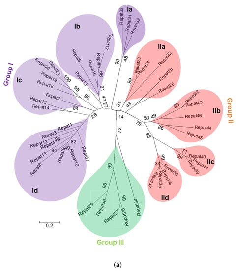 Repat family was initially reported in the transcriptome of S. exigua (GenBank accession number: PRJNA634227), in which 46 members were deposited in NCBI GenBank. These Repat genes were phylogenetically classified into three groups (Figure 1a). Group I was the largest subfamily. It contained 24 members. This group was further subdivided into four clusters: Ia, Ib, Ic, and Id. Group II contained 17 members. Group III contained only five Repat genes. Repat33 was classified into Group Ia along with Repat31 and Repat32.