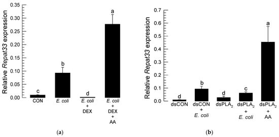 Repat33 expression was inducible to bacterial challenge. However, treatment with dexamethasone known to inhibit PLA2 to block eicosanoid biosynthesis significantly (p < 0.05) suppressed the inducible expression of Repat33 in response to bacterial challenge (Figure 5a). The addition of arachidonic acid (a catalytic product of PLA2) significantly rescued such inhibition of inducible Repat33 expression caused by dexamethasone treatment.