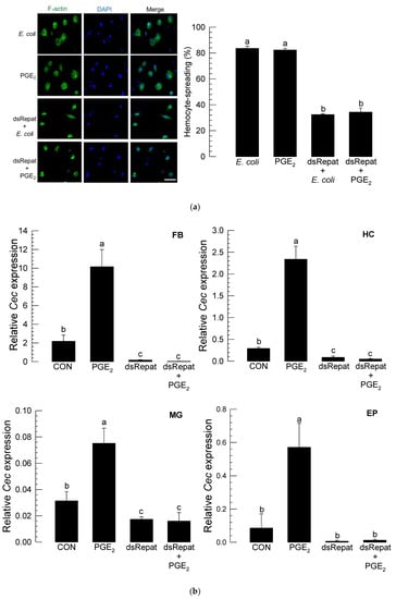The influence of PGE2 mediation on Repat33 expression was analyzed in cellular and humoral immune responses (Figure 6). Hemocyte-spreading behavior induced by bacterial challenge was significantly inhibited by RNAi treatment against Repat33 expression (Figure 6a). PGE2 also stimulated the hemocyte behavior. However, it failed to induce such cellular immune response under RNAi treatment specific for Repat33.