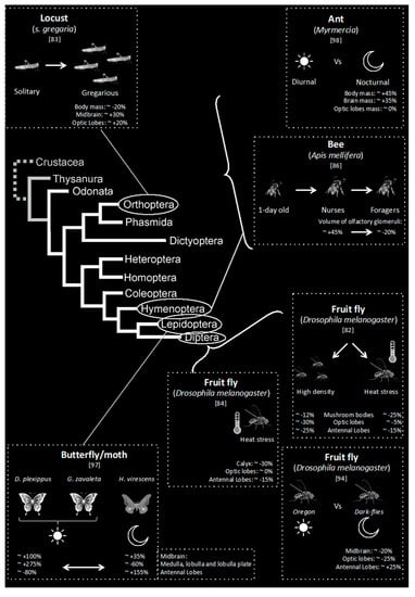 Environment also plays an important role in brain evolution and development in insects. Technau [79] was the first to investigate the effects of environment on insects’ brain size and showed that individual experience impacts brain size (Table 1). Technau counted the number of fibres in the mushroom bodies (higher order processing areas in the central brain that integrates information from the visual and olfactory systems) of fruit flies (Drosophila melanogaster) and found that the number of fibres reduced when individual flies experienced social isolation or were deprived of their antennal input. Similarly, Heisenberg et al. [80] found that that larval density (which might affect social experience) had a positive effect on the number of Kenyon cell fibres (intrinsic neurons of the mushroom bodies), the absolute volume of mushroom body calyces and of optic lobe medulla and lobula (brain areas processing visual information) when these flies become adult. However, these results contrast with those obtained recently by Wang et al. [81] (Figure 2), who found that extreme larval crowding reduced the volume of brain areas such as the optic and antennal lobes (brain areas processing visual and olfactory information, respectively), and central complex (neuropils in the centre of the insect brain that play a crucial role in spatial aspects of sensory integration and motor control). An explanation may be found in the density of flies used by both studies: whereas Heisenberg et al. [80] compared densities between 5–6 to 20–25 flies/cm2, Wang et al. [81] tested densities going to 60 flies/cm2. In this case, it could be interesting to ensure that competition for food access does not affect brain development since a lack of food might affect body and brain sizes.