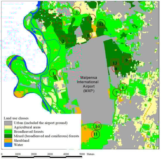 Study area. Map illustrating land use classes and the sampling localities in the surrounding of the Malpensa International Airport, MXP (Ferno and Somma Lombardo municipalities, Varese Province, Italy); numbers indicate the 13 sampling sites where the trial was performed.