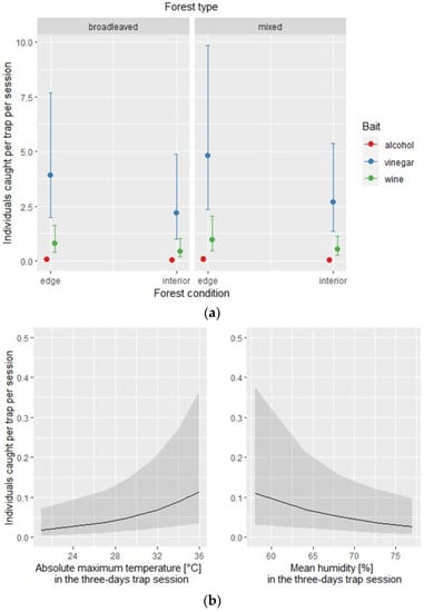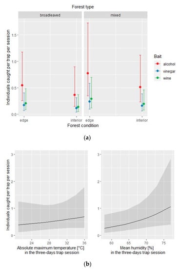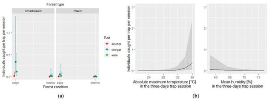 Popillia japonica: effect of the covariates of the negative binomial regression model affecting the number of individuals caught by each of the three traps per site and per session; (a) conditional effect of habitat covariates (forest type: broadleaved vs. mixed; forest condition: edge vs. interior); (b) main effect of meteorological covariates.
