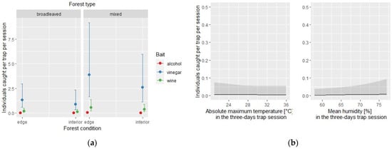 Native species: effect of the covariates of the negative binomial regression model affecting the number of individuals caught by each of the three traps per site and per session; (a) conditional effect of habitat covariates (forest type: broadleaved vs. mixed; forest condition: edge vs. interior); (b) main effect of meteorological covariates.