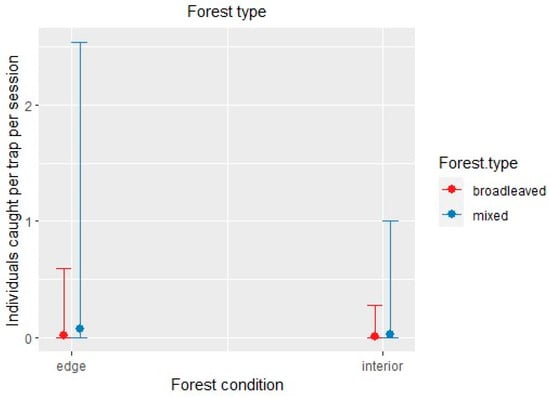 Xyleborinus saxesenii: effect of the negative binomial regression model’s covariates affecting the number of individuals caught by the trap triggered with alcohol per site and session. Only the conditional effect of habitat covariates (forest type: broadleaved vs. mixed; forest condition: edge vs. interior) is shown, as neither of the two meteorological variables showed significant effects.