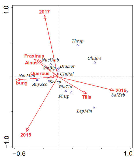 For the statistical analyses, canonical correspondence models were developed in Canoco [37]. The abundances of individual species were analysed as species-dependent variables, whereas the independent environmental variables were year, tree species, temperatures (minimal, mean, and maximal, measured inside and outside the boxes), the presence of nest material, and bung. In a preliminary analysis, the length of the gradient in species variables was calculated (gradient 4.5 SD units long), and the unimodal Canonical Correspondence Analysis was subsequently chosen. There were no rare species (1–2 specimens) collected requiring exclusion from the analysis. Species data were log transformed as skewed by zero counts by the formula Y′ = Y + 1. First, we performed a global test of significance for the explanatory variables (i.e., tree species, season, bung, nest material) to avoid Type I errors resulting from multiple comparisons. We then performed forward selection to investigate the significance of particular variables and their conditional term effect. Significance was tested by Monte Carlo permutation test (499 repetitions).