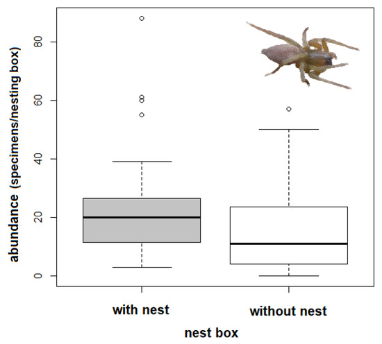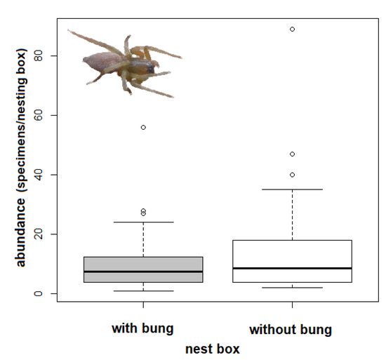 In the U.S.A., McComb and Noble [40] reported arachnids in only 6.7% of nesting boxes, with the lowest abundances found in winter, whereas in our study, spiders were found in almost all (92%) of the nesting boxes. Closing nesting boxes with a bung had a significantly negative effect on the spider abundance in the boxes [19]. Spiders probably use artificial entrances to preferably colonize boxes, but small and flat species can use fissures under the roof or between the wooden walls for entering. During autumn or winter, predatory pressure on invertebrates in nesting boxes is probably not as high as in the spring and summer. Nevertheless, some species of birds (e.g., present Parus major) roost in nesting boxes during winter nights [47].