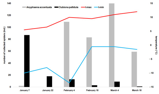 Abundance of Anyphaena accentuata and Clubiona pallidula per box during winter and the maximum and minimum temperature outside the boxes measured 14 days prior to spider collection in 2016.