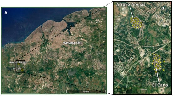 Satellite images showing the study sites. (A) Location southwest of Havana city. (B) Details from control (Arroyo Arenas) and the sterile male release (El Cano) sites; yellow dots indicate the ovitrap location. Image via Google Earth (21 January 2021).