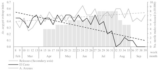 Ovitrap index of Aedes aegypti (solid lines, left Y axis) between epidemiological weeks 8 and 39, 2020, in the release (El Cano) and untreated control (Arroyo Arenas) areas, and the linear trend (dashed lines). The gray bars indicate the number of sterile males released (weeks 15–35) in El Cano (right Y axis).