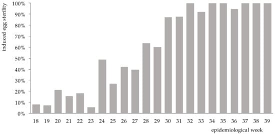 Weekly mean induced egg sterility (%) in the release site El Cano between epidemiological weeks 18 and 39, 2020.