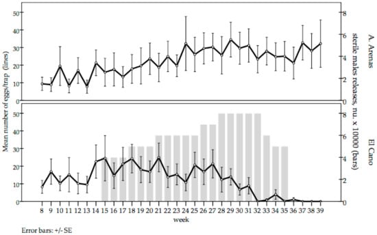 The mean number of eggs/trap were similar during the pre-release period in El Cano and Arroyo Arenas sites. There was a significant reduction in the mean number of eggs collected per trap in El Cano after 5 weeks of releases. The mean number of eggs/trap in El Cano became zero after 17 weeks of releases. Thereafter, a mean of five eggs per trap were collected for 4 weeks, but no eggs were collected during the last 3 weeks, indicating a significant reduction of the wild population density. In contrast, the mean number of eggs/trap in the untreated control area tended to increase during the trial period. During epidemiological weeks 37 to 39, the values of El Cano remained null, whereas in the untreated control area, the mean collections were 32.75, 28.05 and 32.2 eggs/trap, respectively (Figure 4).