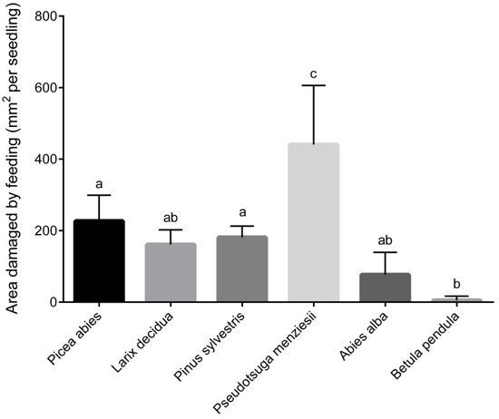 Cumulative mean (± SD) seedling bark surface area consumed at the end of five-weeks experiment on six tree species by Hylobius abietis adults. Different letters above the columns indicate differences (p < 0.05) (Tukey’s multiple comparison test).