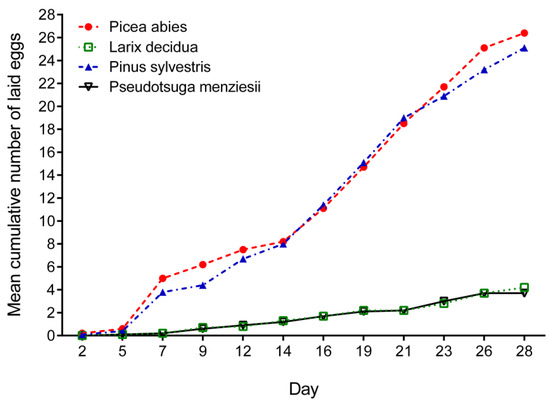 The average egg production during the entire experiment (6 weeks) was almost similar in females fed with P. abies (0.94 eggs per female per day) and P. sylvestris, where average number of eggs per female per day reached 0.89. Six times lower values (RM ANOVA, p < 0.0001) were recorded in L. decidua and P. menziesii, 0.15 and 0.13 eggs per female per day, respectively.