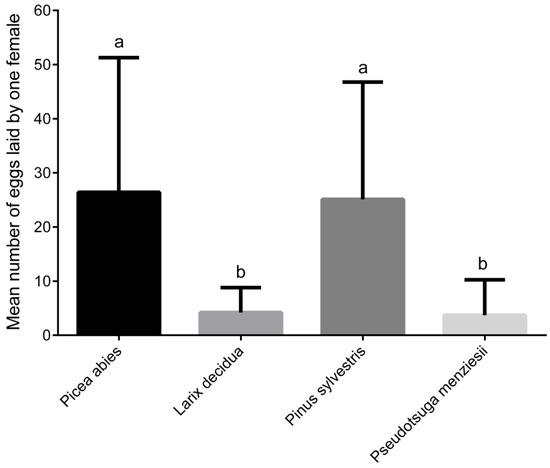 Number of eggs laid by female of Hylobius abietis (mean ± SD) during 28 days experimental period. Different letters above the columns indicate differences (p < 0.05; RM ANOVA).