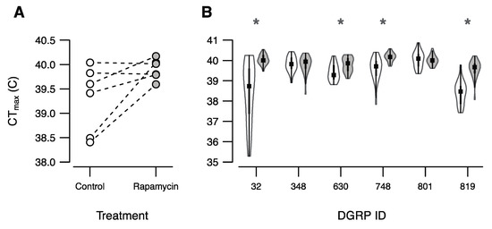 The aim of the current study was to investigate the effect of rapamycin treatment on three fitness components: the upper thermal limit (CTmax) in males, fecundity (number of eggs mated females produced) and male longevity. The DGRP-line average for CTmax of flies exposed to the control treatment ranged from 38.4–40.0 °C, whereas the range of values for flies exposed to rapamycin was 39.6–40.2 °C (Figure 1A). We found a strong and significant genotype-by-treatment interaction (p-value = ), and a significant overall treatment effect (p-value = 0.031). Treatment with rapamycin significantly increased CTmax in four of the six DGRP lines investigated (Figure 1B), and interestingly, the range of CTmax values for the rapamycin treated flies were much narrower than the CTmax of the control flies.