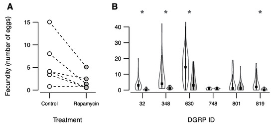 Effects of rapamycin treatment on D. melanogaster fecundity. (A) Interaction plot of DGRP genotypes across the two treatments. Points represent within line and treatment means. (B) Violin plots showing the distribution of fecundity as number of eggs. Each violin represents the distribution of data with a boxplot inside where the median is indicated by a black square. Significant difference in fecundity within lines are indicated with asterisks (p-value < 0.05).