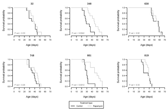 Kaplan–Meier plots of male D. melanogaster longevity within DGRP lines for flies exposed to the control treatment (black line) or the rapamycin treatment (grey line). p-values are from log-rank test.