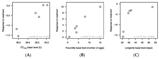Trait-correlations between basal trait level (control treatment) and the phenotypic response to treatment (expressed as ycontrol-yrapamycin, where y represent one of the three phenotypes) for CTmax (A), fecundity (B) and longevity (C). Results are based on the within treatment line means. Spearman’s rank correlation coefficients () with corresponding significance levels are shown for each trait. Numbers above each point are the DGRP line IDs.