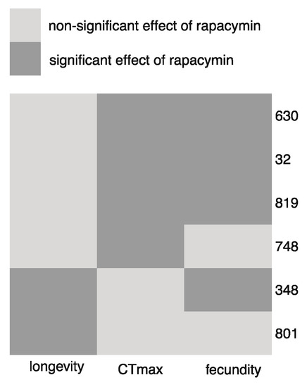 The heat stress tolerance assessed in a temperature-ramping assay in our study revealed that CTmax was significantly higher in male flies that had been exposed to rapamycin in four out of the six lines (Figure 1). Bjedov et al. (2010) [11] studied starvation resistance and found that both male and female D. melanogaster fed with rapamycin had an increased tolerance. These results suggest that rapamycin treatment in D. melanogaster increases robustness towards multiple environmental stresses. Chou et al. (2012) [42] found that the inhibition of mTOR results in a reduced production of heat shock proteins (Hsp). Based on the knowledge that Hsp are important for coping with high temperature stress [43,44] flies treated with rapamycin would then be expected to have reduced CTmax which is opposite to what we see. However, Duncan (2008) [45] found that while rapamycin blocks the translation of Hsp90, it does not affect the translation of Hsp70; thus not all Hsps are inhibited by rapamycin. Our study does not provide an explanation for why rapamycin causes increased heat tolerance in male flies but the involvement of TOR in several stress resistance pathways across a range of species is well known [46,47]. Interestingly, the positive impact of rapamycin on CTmax is not a universal finding across the investigated lines again showing strong impact of genotype on response to rapamycin in this trait. It is well known that the ability to cope with environmental stress including heat tolerance in D. melanogaster degreases with age [48,49,50,51]. Given that rapamycin treatment has anti-aging properties we suggest that the finding of increased heat tolerance in flies feed rapamycin is linked to a younger physiological age of these flies at the time of testing their CTmax (flies ca. 6 days old). This hypothesis needs experimental testing, and our data does not allow for investigating whether the finding of higher CTmax in rapamycin treated flies is linked to altered expression of Hsps in consequence of TOR inhibition.