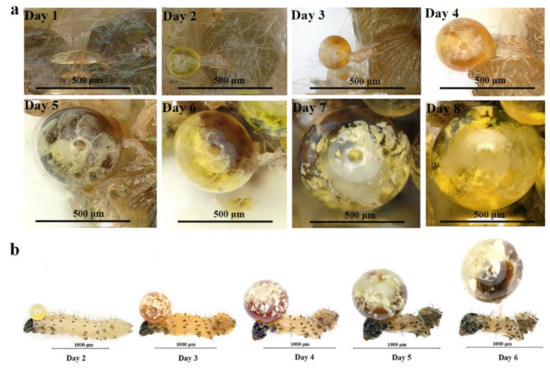 Opisthosoma development in individual Pyemotes zhonghuajia females on (a) eggs and (b) first instar larvae of Spodoptera litura.