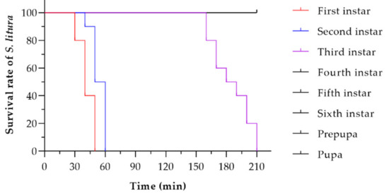 Previous research has shown that single P. zhonghuajia females were able to kill single Yponomeuta spp. early instar or mature larvae in 27 or 48 min, respectively [23]. This partially aligns with the results of our study, in which single P. zhonghuajia females were able to kill single S. litura first instar larva in a similar time frame of 37.1 min; however, they were not able to kill fourth, fifth, and sixth instar S. litura larvae, prepupae, and pupae within the study period of 720 min. Other studies have also demonstrated a similar lack of killing ability by P. zhonghuajia at the same late larval, pupal, and prepupal stages of S. frugiperda and M. separata within 24 h [6,7].