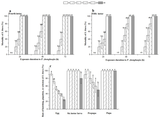 Mortality of fourth to fifth instar larvae. (a, b) Rate of mortality, hatching, pupation, and eclosion (c) of Spodoptera litura when exposed to different mite densities (0, 3, 5, 10, 20, or 40 mites). Different lower-case letters on top of bars indicate significant differences in mortality of different densities of Pyemotes zhonghuajia to fourth and fifth S. litura instar larvae in each exposure duration and in the hatch rate of eggs, pupation of sixth instar larvae, eclosion rate of prepupae, and pupae of S. litura. Different capital letters on top of bars indicate significant differences in mortality of fourth or fifth S. litura instar larvae at different hours, respectively (Tukey’s honest significant difference (HSD) test, p < 0.05).