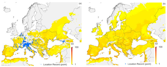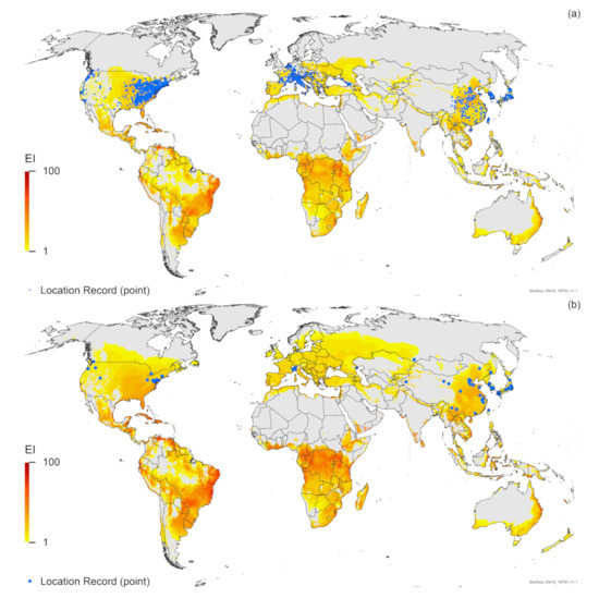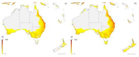 In the RMC analyses where both Asian and Australian locations are treated as native, the analysis using soil moisture (Figure A6a) includes all areas shown to be a match to Asian locations (Figure A3a), which is to be expected. Many of the more northerly areas of Europe, North America and China that show a high match in Figure A5a do not have a high match in Figure A6a. Very little of Europe has a climate similar to that in Asia (Figure A3a), and because we are not including any Italian records as “home” locations in this run, there is not the same level of match throughout the rest of Europe, North America and northern China as in Figure A5a. Although a separate figure is not provided to show this, one of these Italian location records is excluded with a CMI of 0.7 in Figure A6a. This is somewhat problematic, given that T. mitsukurii occurs and is spreading in Italy [17,27,48,79], implying that the climate in Italy is suitable. This would suggest that the location records available in both Australia and Asia do not reflect the full climatic tolerances of T. mitsukurii. By contrast, the RMC using the four factors of minimum temperature, maximum temperature, rainfall amount and rainfall pattern (Figure A6b) includes all location records for T. mitsukurii, and projects more areas globally to have climates similar to where this species is currently found. Moreover, not surprisingly because the Australian location records are included in this analysis, an overall larger area globally is projected to match the climates of the Australian and Asian records (Figure A6b) than in the comparison to the Asian records only (Figure A3c).