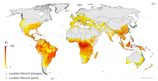 Modelled global climate suitability (CLIMEX Ecoclimatic Index) for (a) Halyomorpha halys [7], (b) Trissolcus japonicus [39] and (c) Trissolcus mitsukurii. Suitability for all three species is mapped as a composite of natural rainfall and irrigation based on identified irrigation areas [77]. Circles are point location records; triangles are polygon records.