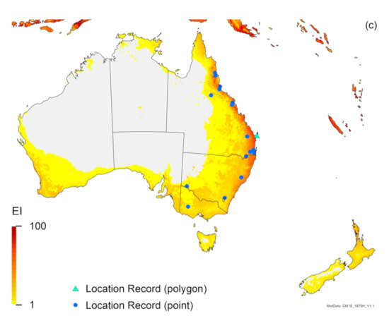 It is interesting that a CMI threshold of <0.7 is necessary in all of our RMC analyses to include known location records. With only three factors (minimum and maximum temperature and soil moisture) used in the analysis, it should be easier to achieve a high CMI than with the four default factors (minimum and maximum temperature, rainfall amount and pattern) commonly used in analyses where a CMI of 0.7 is considered to be the standard [42,44,71]. Although another study [70] used a different approach in an RMC analyses, these authors also only use three factors (minimum and maximum temperature and rainfall—they do not specify whether they used rainfall amount or rainfall pattern, although rainfall amount would have been the more plausible parameter to have used), yet still conclude that a CMI > 0.7 is a good threshold to use in pest risk analyses. This appears to be the first RMC analysis attempting to compare the climate of known invaded regions with that of known native locations. Other RMC analyses pool all (or most) known location records as the “home” locations to be compared to the rest of the world, to identify regions at risk of a pest. Clearly, as these analyses have shown, the climates of both native and exotic locations of T. mitsukurii are not very similar, no doubt because climate in the native distribution does not experience the range of climates found in Italy and Australia. In an RMC analysis, by definition, all input (home) locations have a perfect match with themselves; hence, had we used both native and exotic location records as “home” locations to compare to the rest of the world, all known location records would necessarily have a high CMI.