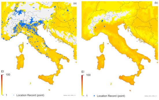 For Australia and New Zealand, the two Trissolcus species have similar modelled potential distributions, but the potential distribution of T. mitsukurii in Australia is expected to range further inland, and in New Zealand, the North Island is projected to be marginally more suitable for T. mitsukurii than for T. japonicus (Figure 2). All known locations in the non-native (exotic) range fall within areas projected by the model to be suitable for T. mitsukurii (Figure 1c), with EI values ranging from 1 to 59 in Australia (Figure 1c and Figure 2c) and ranging from 19 to 30 in Italy (Figure 1c and Figure 3c).