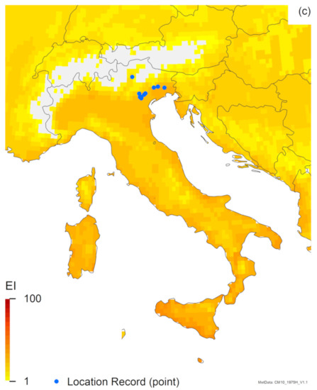 Modelled climate suitability (CLIMEX Ecoclimatic Index) for (a) Halyomorpha halys, (b) Trissolcus japonicus and (c) Trissolcus mitsukurii in Italy. Suitability for all three species is mapped as a composite of natural rainfall and irrigation based on identified irrigation areas [77].