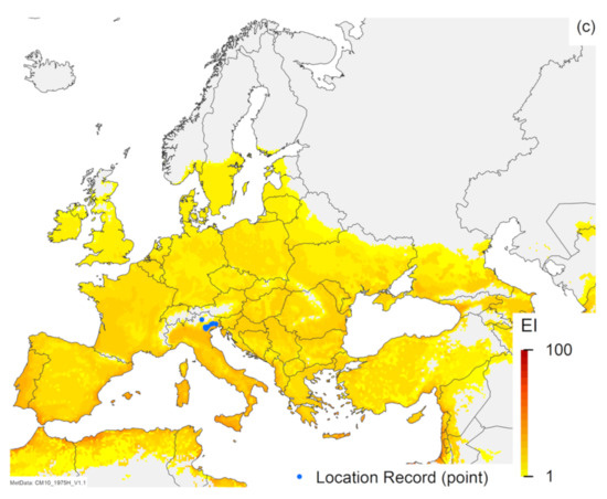 Modelled climate suitability (CLIMEX Ecoclimatic Index) for (a) Halyomorpha halys, (b) Trissolcus japonicus and (c) Trissolcus mitsukurii in Europe modelled using CLIMEX Compare Locations. Suitability for all three species is mapped as a composite of natural rainfall and irrigation based on identified irrigation areas [77].