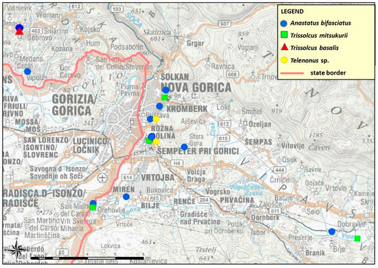 Map of Anastatus bifasciatus, Trissolcus mitsukurii, Trisssolcus basalis and Telenomus sp. records in Western Slovenia.