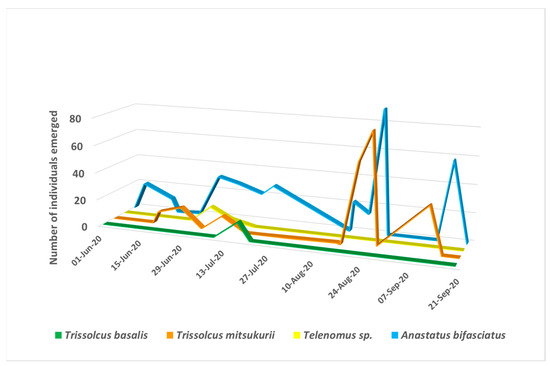 The four egg parasitoids observed in 2020 showed a different seasonal occurrence (Figure 2). While Telenomus sp. and Tr. basalis were observed once in the season, from early to mid-July, An. bifasciatus was present throughout the whole season with two noticeable peaks, in the second half of July and in the second half of August. Trissolcus mitsukurii first appeared in mid to late June in small numbers, and the peak occurred in the second half of August.