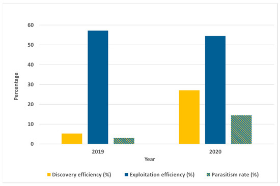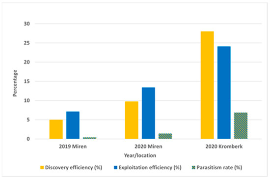 In 2020, the overall parasitism rate was 14.4%, noticeably higher than in 2019 (3.0%). The increased impact of parasitoids in 2020 was also confirmed by higher discovery efficiency (27.1%) and a high level of exploitation efficiency (54.5%) (Figure 3). In 2019 and 2020, the overall predation rates were 6.2 and 5.6%, respectively (Table 2).