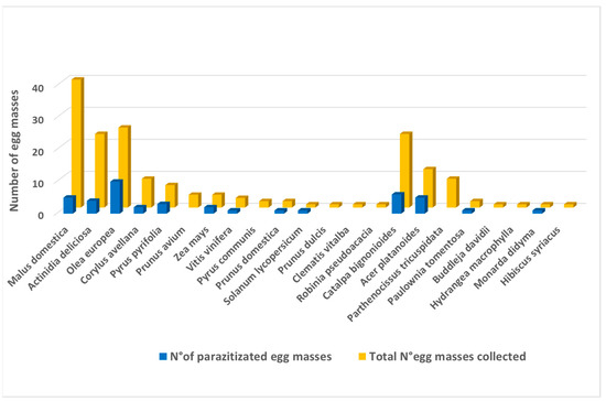 During the survey, a total of 22 H. halys oviposition hosts were recorded (Figure 5). Malus domestica Borkh., Actinidia deliciosa (A.Chev.) C.F.Liang & A.R.Ferguson, Olea europea L., Corylus avellana, Pyrus pyrifolia (Burm.f.) Nakai and Zea mays L. were the most common oviposition hosts in the agricultural area. Among the fruit crops, apple was the main host, with 41 egg masses collected, almost a quarter of all H. halys egg masses collected in the region (Figure 5).