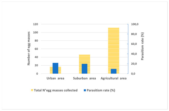 In general, the lower parasitism rates found in agricultural areas are related to pest management techniques undertaken in orchards, including broad-spectrum insecticide treatments. The compatibility of biological control with insecticide application is a key concern for a natural enemy establishment and the impact on pests in agroecosystems [75]. Insecticide treatment has a great impact on the reduction of parasitoid emergence from parasite egg masses [76].