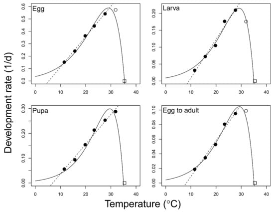 To estimate the “conceptual” upper development thresholds () and operative thermal range by incorporating the non-linear portion of the development rates, we used the following six models (i-vi). The observed developmental rate was fitted against experimental temperature, using PROC NLIN in SAS 9.4 [27]. Due to the risk of bias estimation of the upper threshold (, we excluded the data point at 35.4 °C that all individuals did not develop to next stage from curve fitting (Table 1).