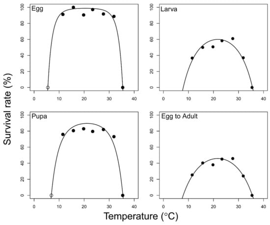 In each egg, larval, and pupal stage, the survival rate was calculated by dividing the number of individuals that successfully developed into the next stage by the initial number at a specific stage. The survival rate of the total immature period was calculated by multiplying the survival rates from larvae to adult emergence by the survival rate of the eggs. The survival rates of the eggs and pupae showed relatively high survival rates at 11.5 °C, which is the lowest temperature in our experiments (Table 1). Because the survival curve is generally a symmetric bell-shaped distribution [42], we used imaginal points, the lower development thresholds of egg and pupa, calculated from each of linear models. Each stage-specific survival was fitted against the temperature using the following model [42]:
