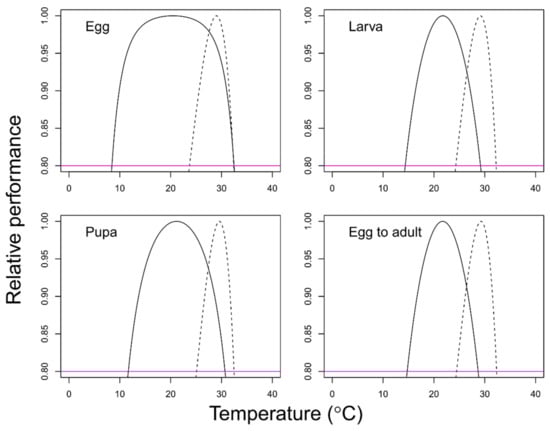 - Dixon, A.F.; Honěk, A.; Keil, P.; Kotela, M.A.A.; Šizling, A.L.; Jarošík, V. Relationship between the minimum and maximum temperature thresholds for development in insects. Funct. Ecol. 2009, 23, 257–264. [Google Scholar] [CrossRef]