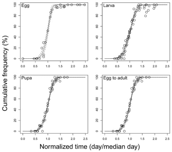 The variation in development time for each stage was described using the cumulative frequency distribution of developmental completion. The development times were normalized to the median development time to characterize the temperature-independent development distribution [41]. The cumulative frequency of development was then fitted against the normalized time (day/median day) using the two-parameter Weibull cumulative function [41]. The data for all temperatures of each stage were used to fit the model after normalizing the development time.