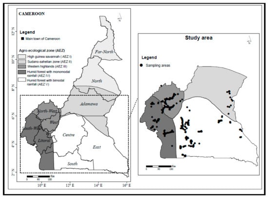 Map of Cameroon with names of its ten regional capitals (Extreme-north, North, Adamawa, North-West, South-West, West, Centre, Littoral, East, South), the five agro-ecological zones and the fields visited during the exploratory phase.