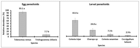 Six species of parasitoids were found from the field study; two egg parasitoids and four larval parasitoids (Figure 2). The egg parasitoids were T. remus and Trichogramma chilonis (Ishi) and the larval parasitoids were Charops sp., C. luteum, C. sesamiae, and C. icipe. All these species were identified to species level by NHM except for C. sesamiae which is already reported [34] and Charops which is likely a new species. The specimens from Cameroon were compared with all world species except Charops flavipes (Brullé) whose holotype could not be obtained by the museum during the time of this work. The Cameroonian species was different from all the world Charops species obtained. Between the two egg parasitoids, T. remus was the most abundant with a relative abundance of 93.1% (11,140 individuals; χ21,40) = 12.77.; p = 0.0004). It is extremely tinny (only 0.5 mm in length) and invisible to naked eyes in the field as well as in the laboratory, but is also the most widely distributed. The second egg parasitoid T. chilonis comes from a group of species that, however, are similar to each other and are also very small in body size (about 0.5 mm) with 101 individuals (7.7%). The most abundant larval parasitoid was C. icipe with 133 individuals (65%) followed by Charops. sp. with 48 (24.8%), C. sesamiae with 20 (7.3% and lastly C. luteum was 3 (2.9%) (χ23,80) = 24.82; p < 0.0001; Figure 2).