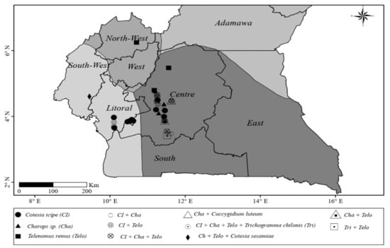 Six parasitoids species, composed of two egg parasitoids and four larval parasitoids, were found during this study. While conducting similar work in three different countries in East Africa, four species were found [36]. Except for the egg parasitoids T. remus and T. chilonis, as well as the gregarious larval parasitoid C. sesamiae, they found the other three larval endoparasitoids recorded in the current study, in addition to Palexorista zonata (Curran) (Diptera: Tachinidae) and one egg parasitoid C. curvimaculatus which was not found in our study. However, in Niger alone, eight parasitoids were recorded including three egg parasitoids Trichogrammatoidea sp., Trichogramma sp., and Telenomus sp.; one egg-larval parasitoid Chelonus sp.; four larval parasitoids, Cotesia sp., Charops sp., and unidentified ichneumonid and tachinid [29]. The presence of T. chilonis in Cameroon is the second report in Africa on fall armyworm after Kenya [35]. However, 18 species of Trichogramma were already recorded long ago, with eight Trichogrammatoidea and 11 Telenomus species from eggs of borer pests [37,38]. The egg parasitoids T. remus is also the main egg parasitoids of FAW in North and South America [22,23,24]. The current study is therefore significant for the development of biological control of spodopterans. However, such efforts will be guided by ecological factors such as climate, host plant, and host insect because the present study showed differences in distribution and abundance of the various parasitoid species in the study locations, agro-ecological zones, host plants, and host insects. Similar studies are therefore required not only countrywide in Cameroon but through all major maize production areas in Africa where FAW is a potential or real threat to maize production.