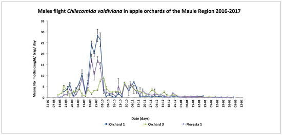 A total of 5596 males of C. valdiviana were captured in the three orchards over the full season of monitoring male moth flight. The first males appeared between 12 and 19 August 2016 (Figure 1). Subsequently, male catch increased steadily towards the end of August, peaking between 21 and 27 September 2016. Captures decreased after 15 November, until nearly ending on 28 January 2016 (Figure 1).