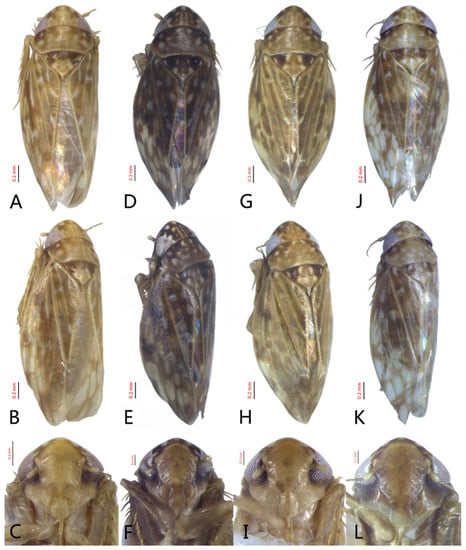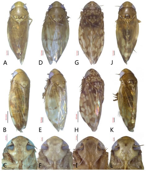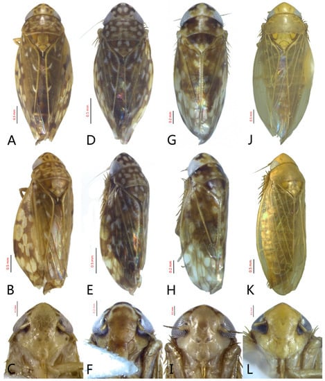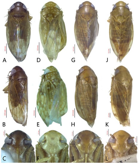 - Anufriev, G.A.; Emeljanov, A.F. Suborder Cicadinea (Auchenorrhyncha). In Keys to the Insects of the Far East of the USSR; Ler, P.A., Ed.; Nauka: Saint Petersburg, Russia, 1988; Volume 2, pp. 12–495. [Google Scholar]