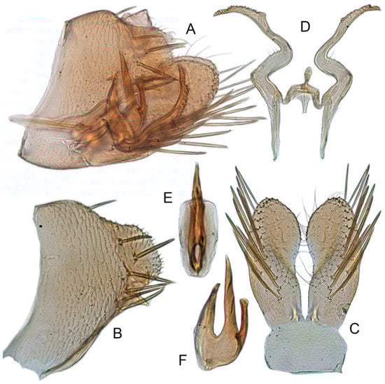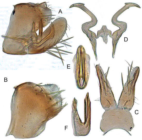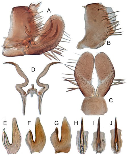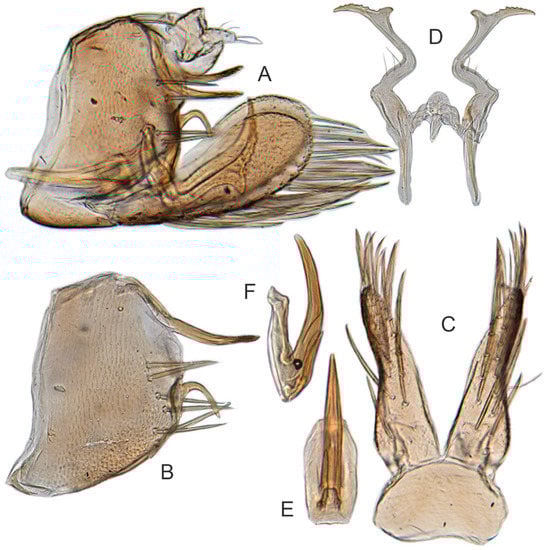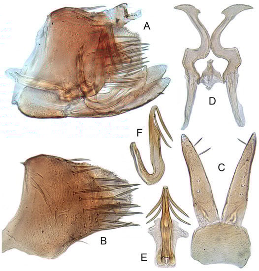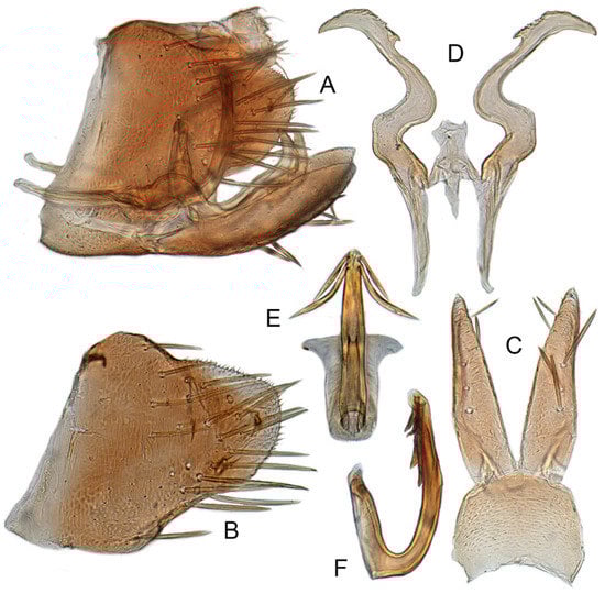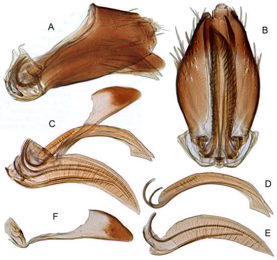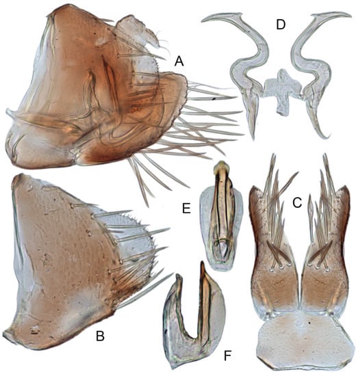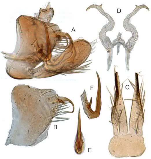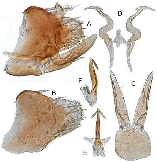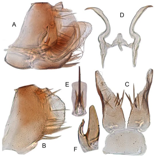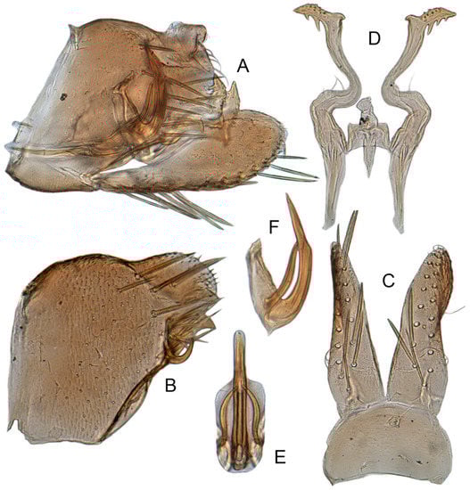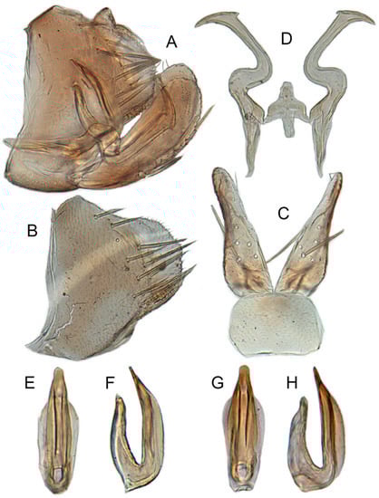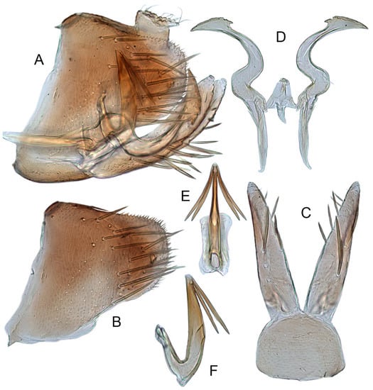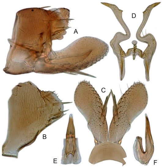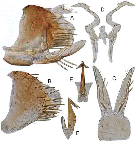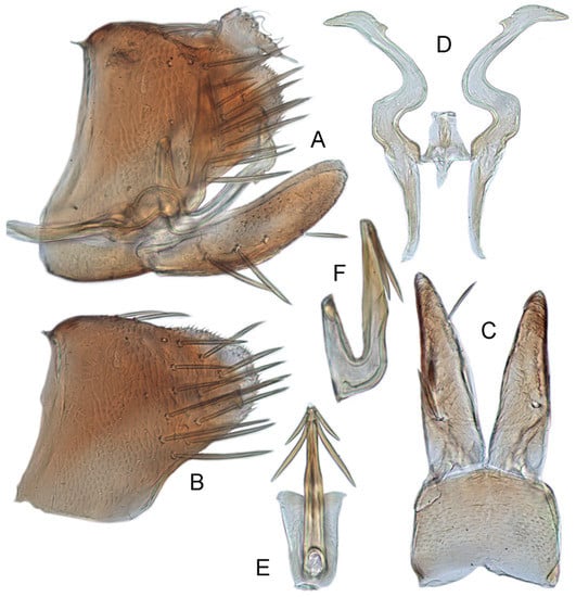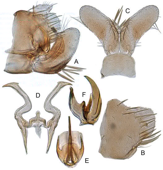 - Aedeagus with two pairs of apical processes (Figure 10E,F).....................................................................................................................................13