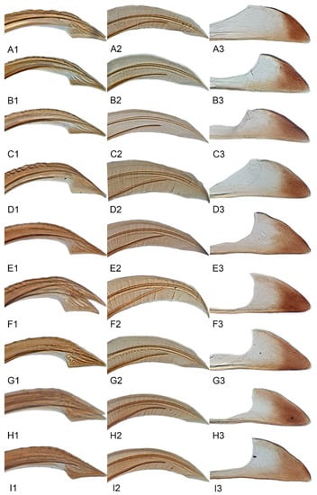 - Aedeagal shaft abruptly narrowed to distal third of shaft (Figure 15F), bases of two pairs of apical processes separated (Figure 15E,F)............................................................................................................................................................................................................exproiecturus sp. nov.